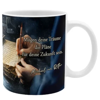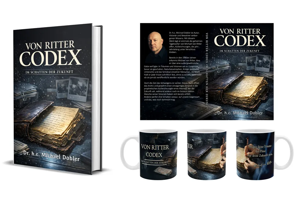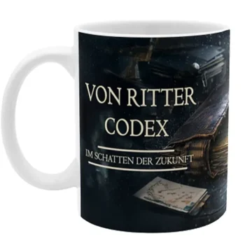 Anlässlich der Neuerscheinung des Buches „Von Ritter Codex – Schatten der Zukunft“ präsentieren wir eine exklusiv entworfene Michael von Ritter Tasse. Das von uns entwickelte Design greift die visuelle Identität des neuen Titels auf und überzeugt durch eine hochwertige, vollflächige Farbgestaltung.