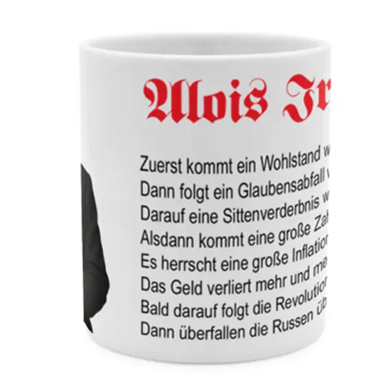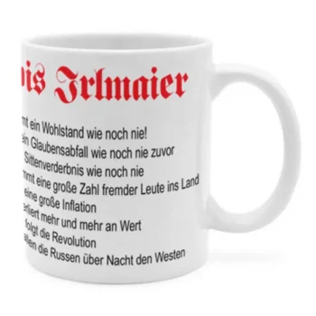 Diese Tasse vereint das Abbild von Alois Irlmaier mit einer seiner wichtigsten Prophezeiungen: den 8 Vorzeichen. Die Kombination aus dem Porträt des Sehers und seinen zentralen Vorhersagen schafft ein sehr ungewöhnliches Design, das die Geschichte Irlmaiers direkt in den Alltag bringt. Ein besonderes Design, das die bedeutendsten Vorhersagen Irlmaiers in einem einzigartigen Look auf einer Tasse vereint.